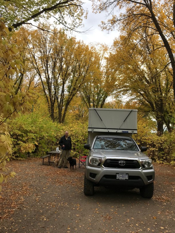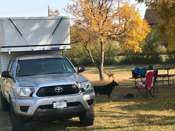 So, apparently our brain, when we hit age 60, deteriorates twice as fast as before. Wow, that’s so scary. Neil and I decided to challenge something new to stimulate our brains, and one idea was camping. We live in such a beautiful land, we should enjoy this grand North American nature and share our joy with our beloved dogs. So we bought an used Toyota Tacoma, then bought a collapsible camper that goes on top of the truck. Our dream came true when we headed out on September 4 for a relaxing, spontaneous, no set itinerary trip toward Saskatchewan.