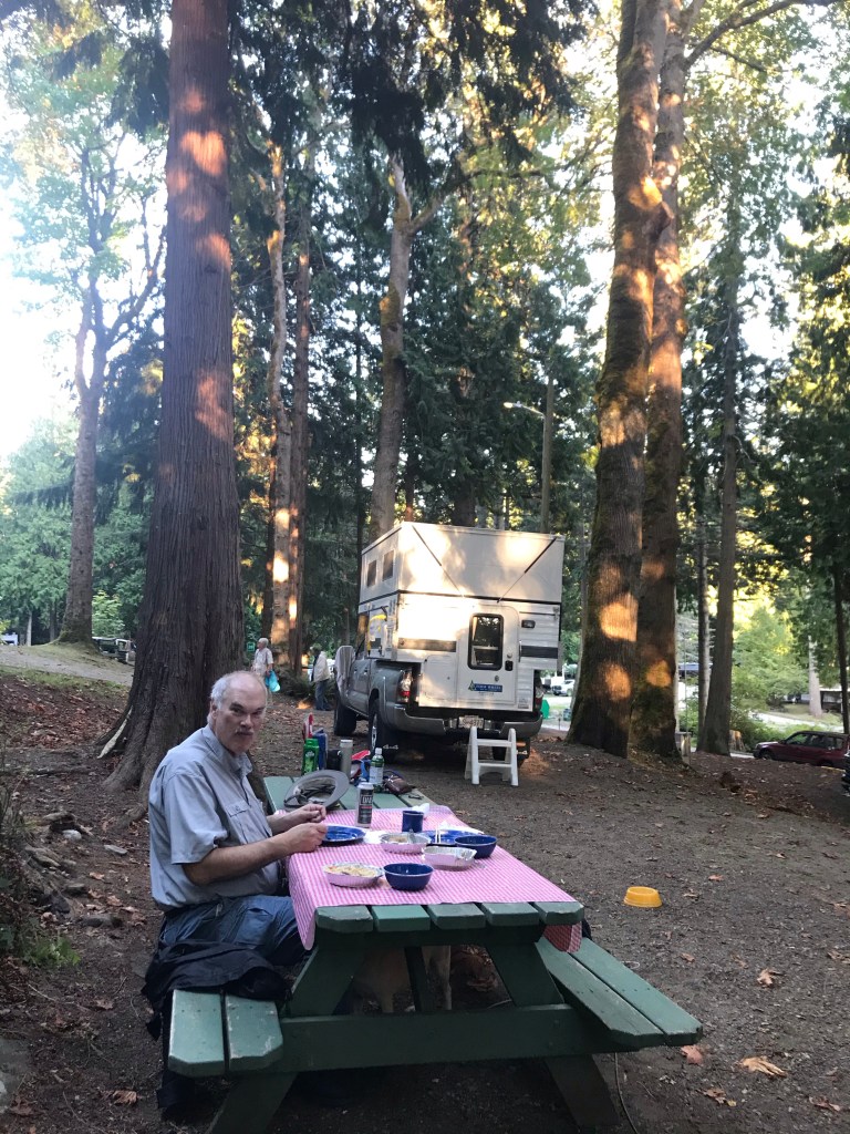 Well….the fifth day of our camping trip, we left Seal Bay for the next camping destination. First we made a brief stop at a winery we found nearby. We had a bit of tasting, and bought a bottle of full-bodied Meritage. We stopped at a gigantic grocery store in Campbell River, then headed to the Alder Bay Campgound which is about 2 hours drive north of Campbell River.