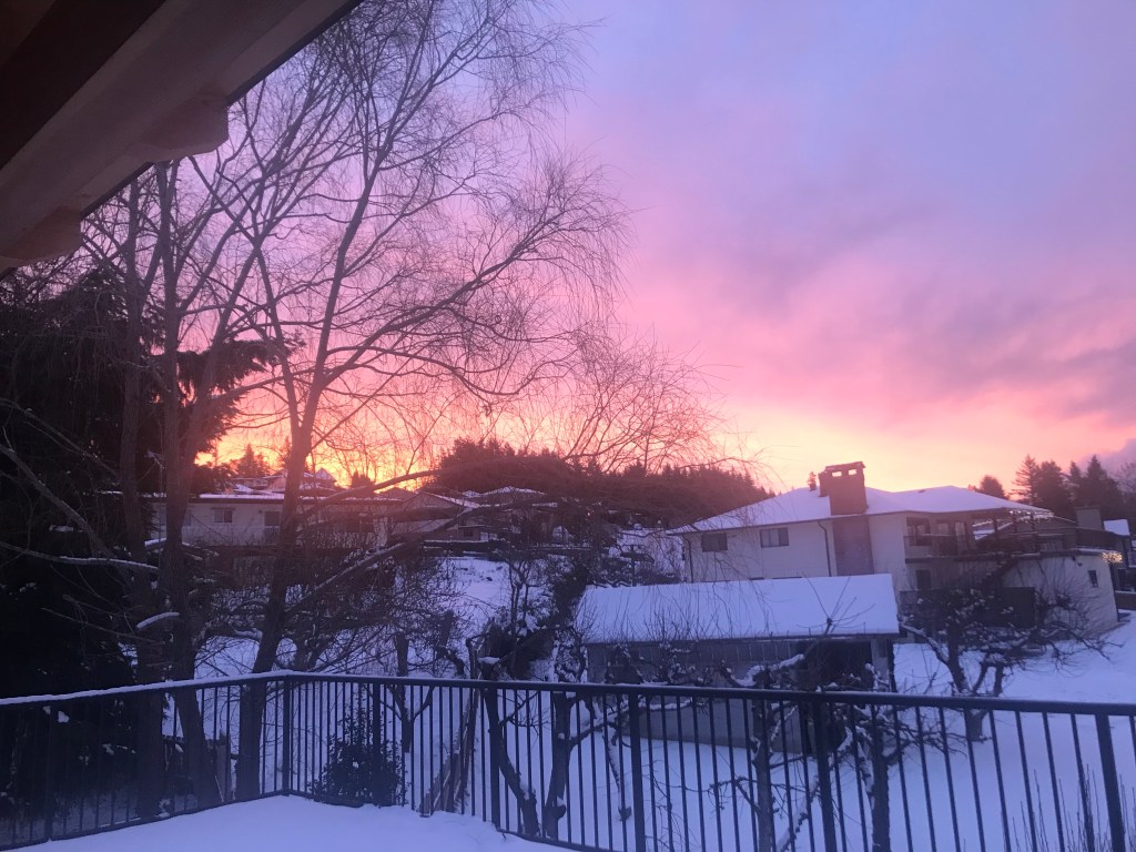 I am looking out the window from our house in Powell River. It is a pure white snowland…